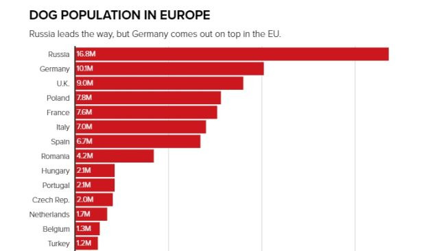 위 사진은 유럽의 국가별 애완견 숫자인데요. 러시아가 상대적으로 애완견을 많이 키우는걸 볼수 있습니다.